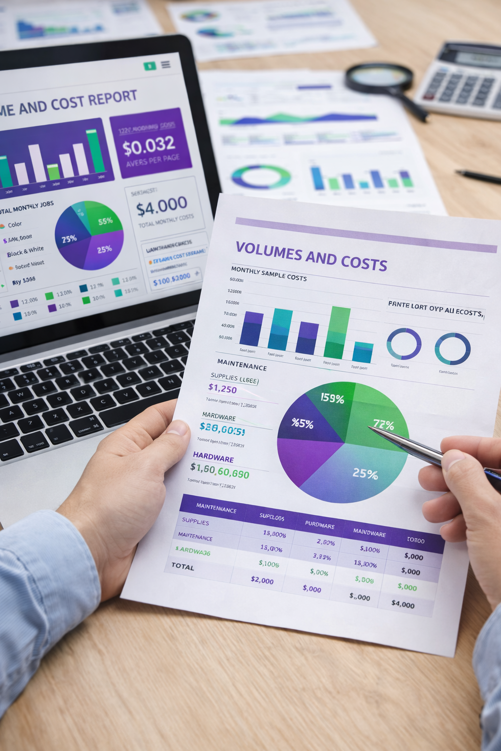 Zyskujesz szczegółowe raporty, pokazujące realnewolumeny wydruków i koszty utrzymania maszyn wraz z analizą opartą obadanie rynku. Zweryfikujesz swoje potrzeby i sprawdzisz możliwości.